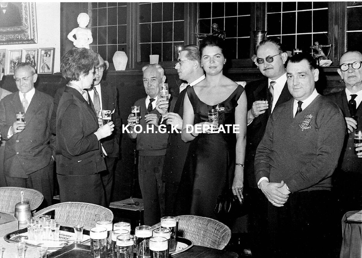Formaat : 13 x 18 cm. - Ontvangst van een delegatie Duitse journalisten op uitnodiging van het Stadsbestuur en de directie van de Kursaal. Hier in de Sint-Sebastiaansgilde. Vooraan, de heer en mevrouw De Ramée, directeur van de Kursaal