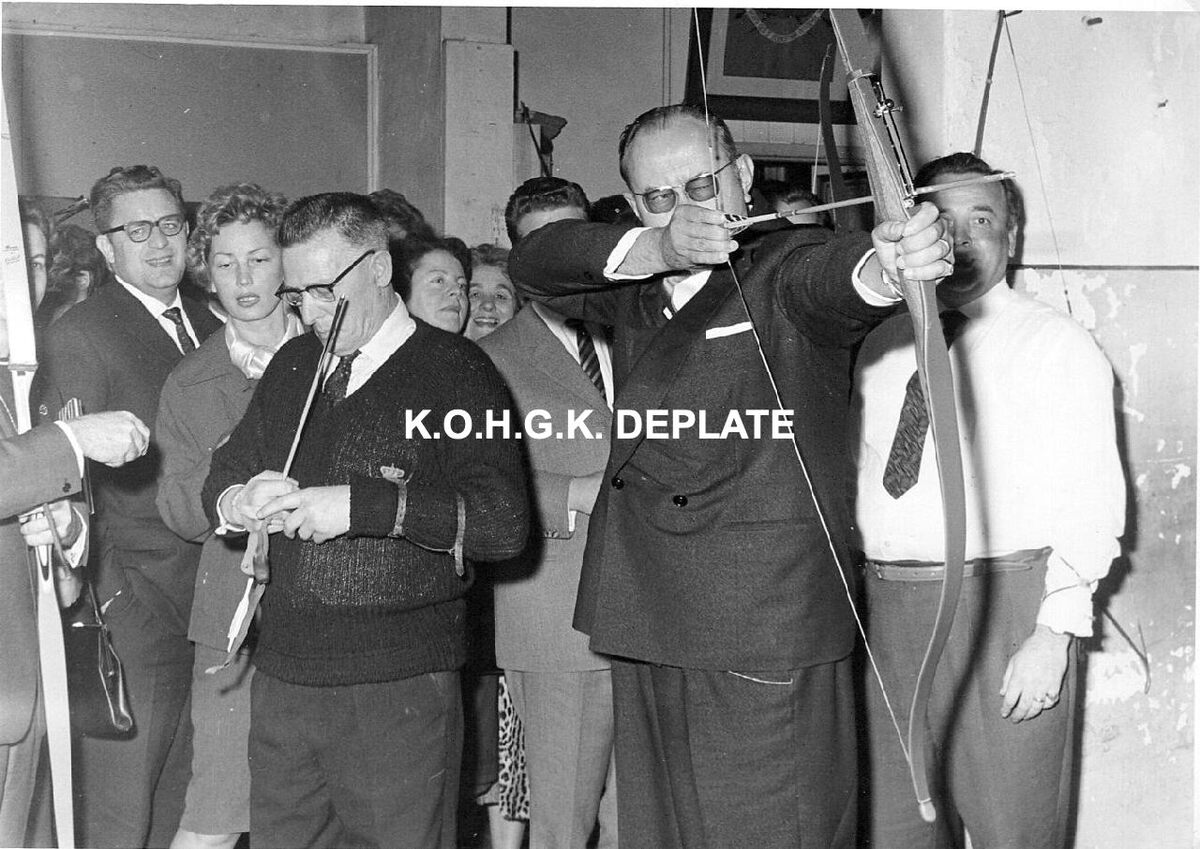 Formaat : 13 x 18 cm. - Ontvangst van een delegatie Duitse journalisten op uitnodiging van het Stadsbestuur en de directie van de Kursaal. Hier in de Sint-Sebastiaansgilde. Roger De Ramée, directeur van de Kursaal, mag het ook eens proberen.