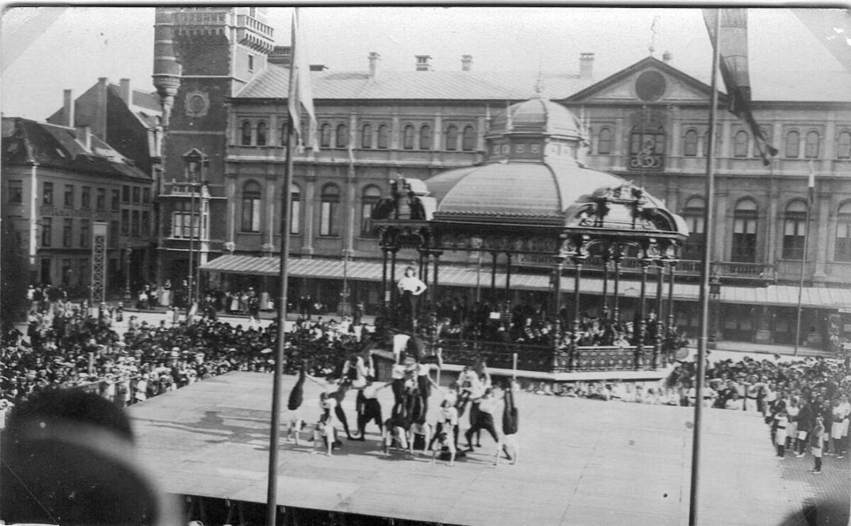 Formaat : 8,5 x 13,5 cm. - Met muziekkapel op de kiosk. Op de achtergond, het Stadhuis. - Map foto's 05b