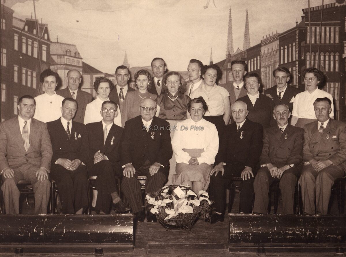 Formaat : 13 x 18 cm. - Personeelsfeest van de firma "Fichefet" in het lokaal "Prins Boudewijn", Sint-Sebastiaanstraat 22. Vereremerkte werknemers en hun familie. Paul Fichefet, links naast mevrouw, ontving uit de handen van minister Adolf Van Glabbeke, de gouden medaille van de Orde van Leopold II. Kregen het Nijverheidsereteken : Jules Fichefet, Joseph Soenens en W. Van de Casteele. Kreeg het nijvereheidsereteken tweede klasse : Prosper Versieck. - Bron : Het Kustblad, 05/05/1954,p.2,foto.