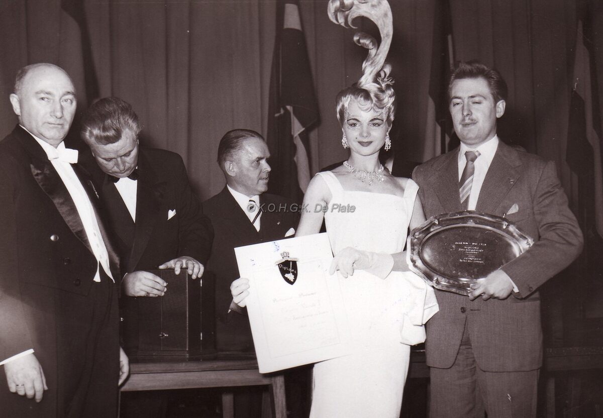 Formaat : 13 x 18 cm. - Burgemeester Adolf Van Glabbeke overhandigt een schaal en bijhorend diploma aan de heer Vermote.