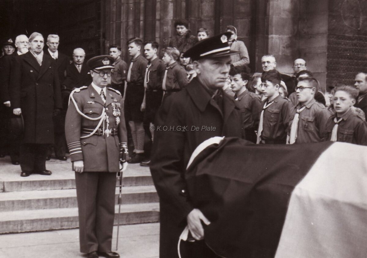 Vrijdag 6 februari 1953. Begrafenis van vier van de slachtoffers. Een lijkkist bedekt met de Belgische vlag wordt ingeladen. Scouts vormen de erehaag aan de Sint Petrus en Pauluskerk.