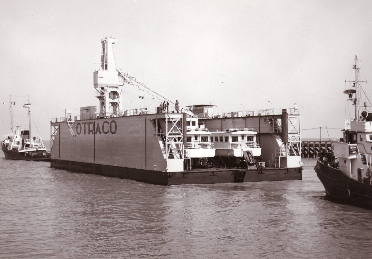 Formaat : 13 x18 cm. - Het droogdok van de firma OTRACO geladen met de twee rivierboten Kaloma en Kitoma, vertrekt naar Belgisch Congo, op sleep door de Nederlandse zeesleepboot Oostzee.