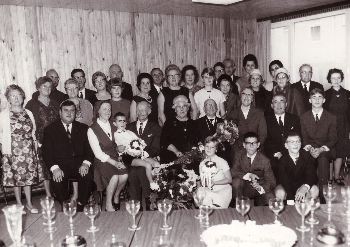 Formaat : 13 x 18 cm. - Pierre Madelein en echtgenote Veronique Depoorter, woonachtig te Oostende, Werkzaamheidstraat 43, gehuwd te Richmond (G.B.) op 6 oktober 1917, vierden hun gouden bruiloft te Oostende op 6 oktober 1967. Waarnemend schepen Jozef-Marie Porta, links van mevrouw Depoorter vertegenwoordigde de stad.