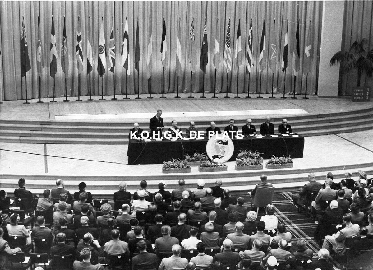 Formaat : 13 x 18 cm. - In de concertzaal. Op de achtergrond, de vaandels van de 20 deelnemende landen.