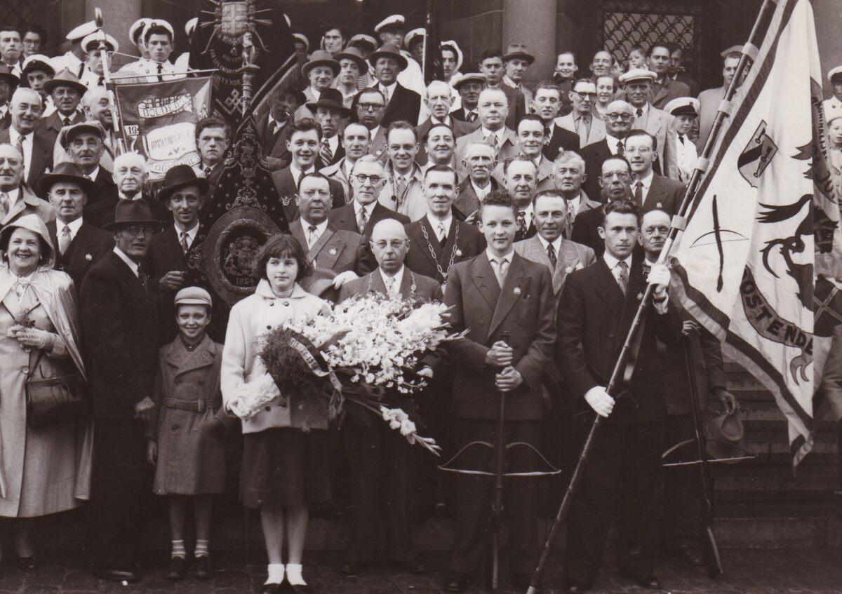 De feestvierende balboogschutters de Sint Jorisgilde, met vlag op de trappen van het dienstdoend stadhuis (huidig gerechtsgebouw) ter gelegenheid van het 100 jarig bestaan van de vereniging. Links staan ook de leden van de bolders, wier vereniging in hezelfde lokaal Café Armenonville in het Maria-Hendrikapark gevestigd was.
