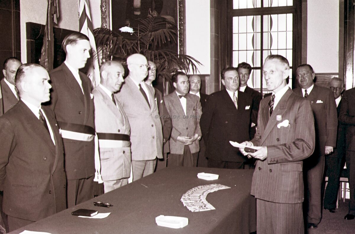 Congres der pasteibakkers 1954.Ontvangst op het stadhuis. Achter de tafel van links naar rechts burgemeester Adolf VAN GLABBEKE, schepenen Jan PIERS en Kamiel DEHOUCK, stadssecretaris Michel SURMONT.
