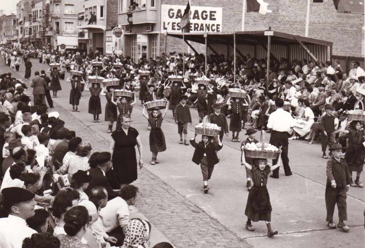 Een groep kaas- en eierboertjes passeert de tribune tijdens de zomercavalcade.