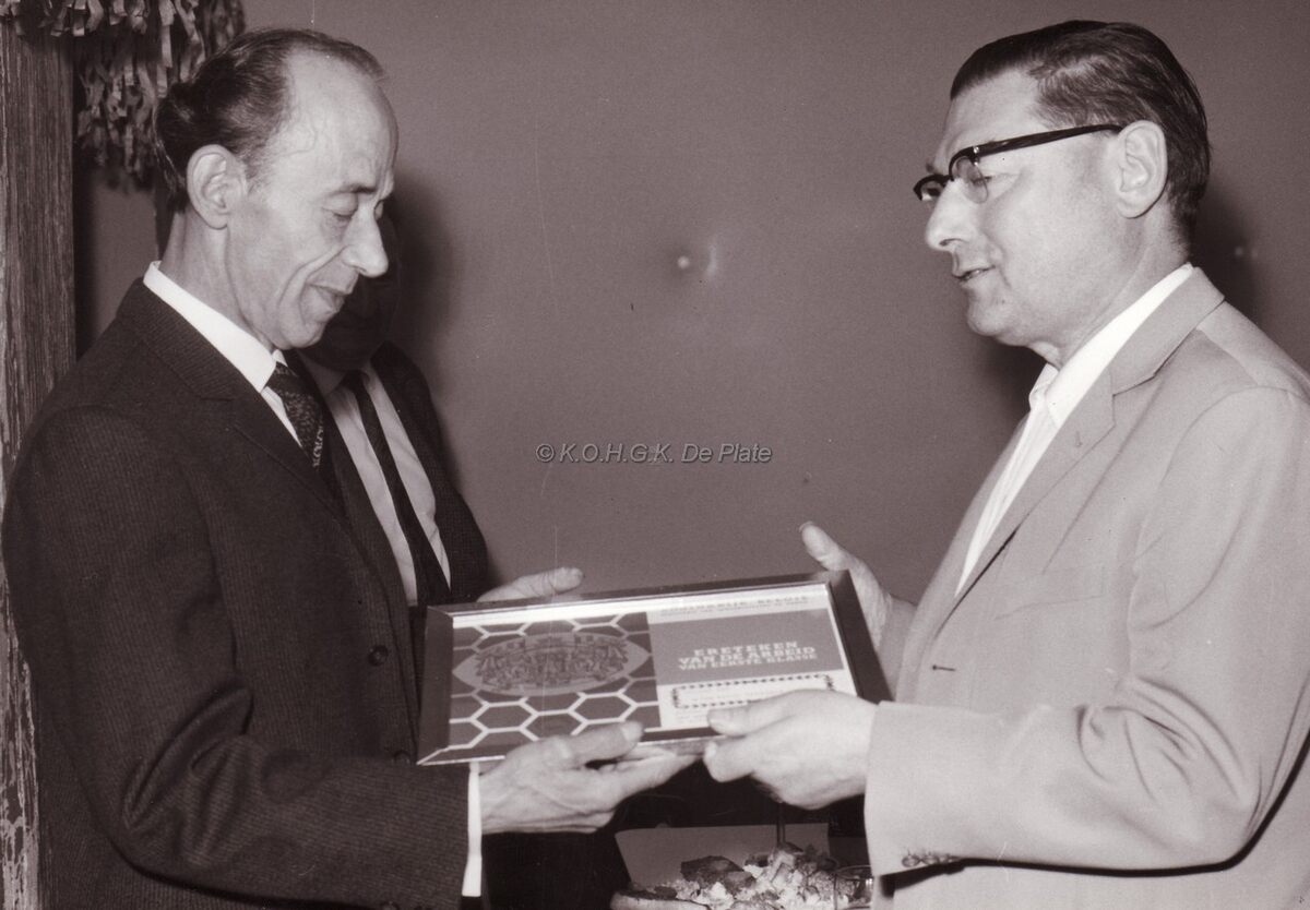 Daniël Verbanck, gekend onder zijn tweede voornaam Willy, ontvangt uit de handen van Pierre Vanhakendover, uitbater van cinema Rialto, het document dat hem laureaat van de arbeid, 1ste klasse toekent. Hij had toen 35 jaar dienst als operateur in de cinema Rialto.