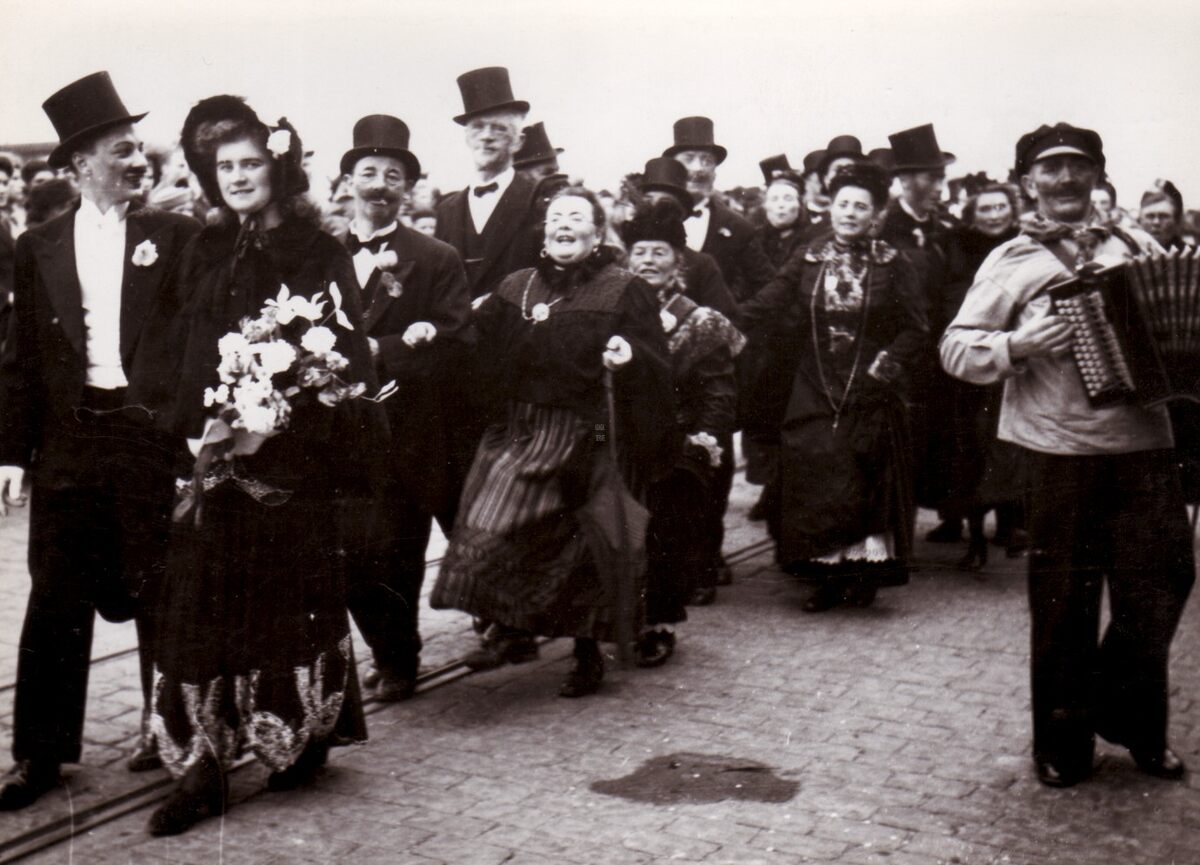 Formaat : 13 x 18 cm. - De folkloregroep "Het Huwelijk van Paul en Louise" uit Bredene in de halfvastenstoet op de Visserskaai.