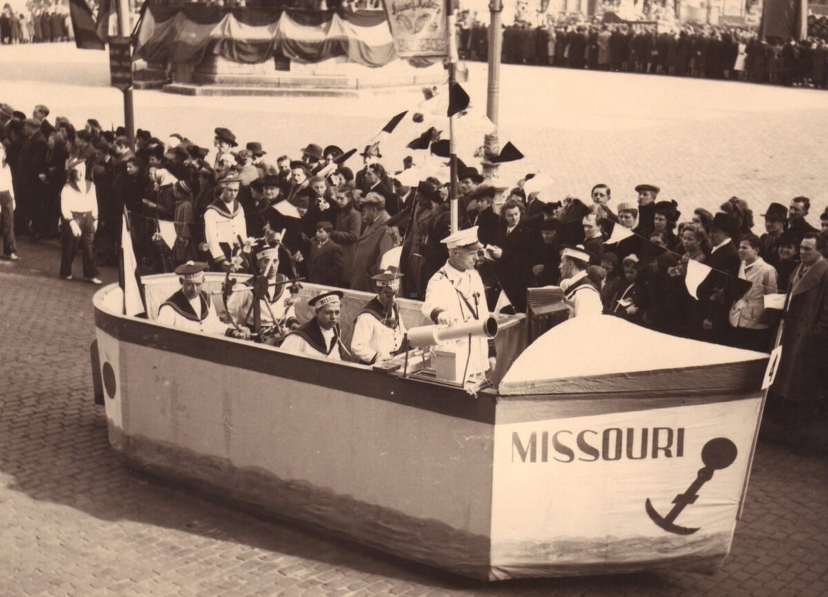 Een praalwagen "Missouri" in de halfvastenstoet op het Wapenplein.