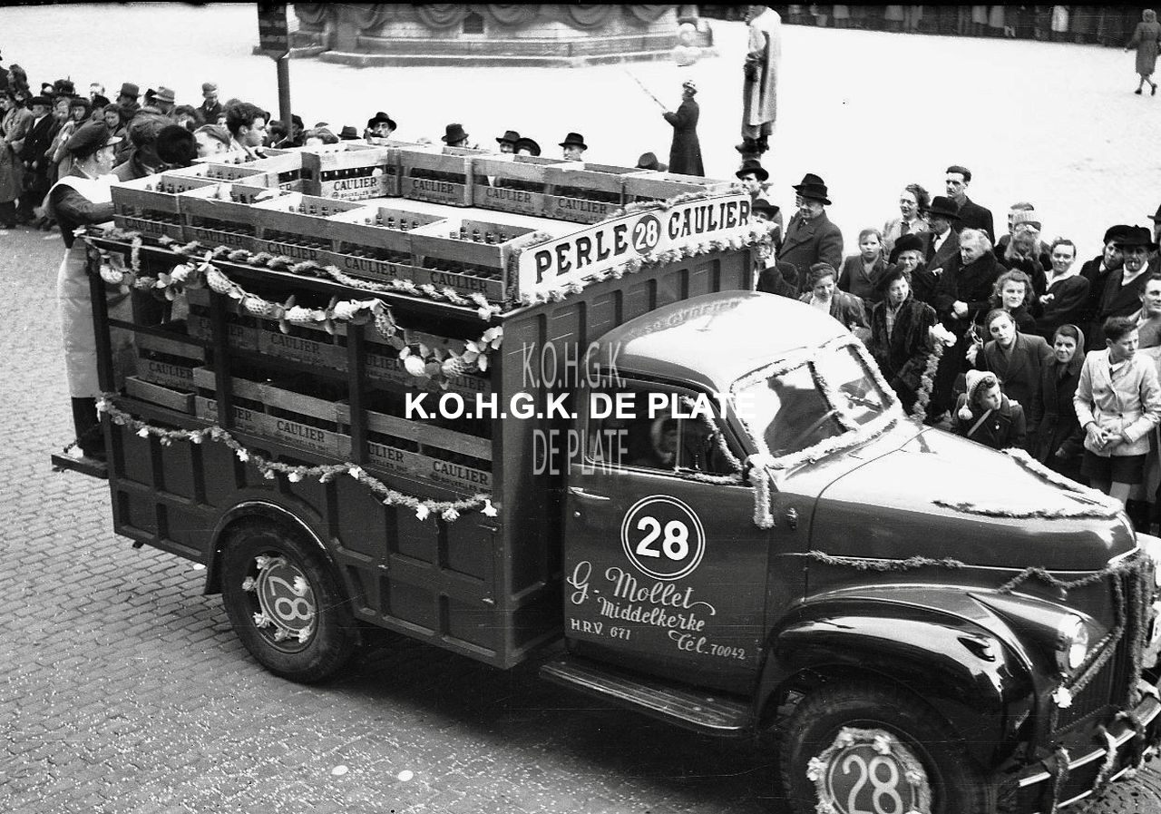Negatief : 4 x 6,5 cm. - De vrachtwagen van bierhandel G. Mollet uit Middelkerke, hier op het Wapenplein
