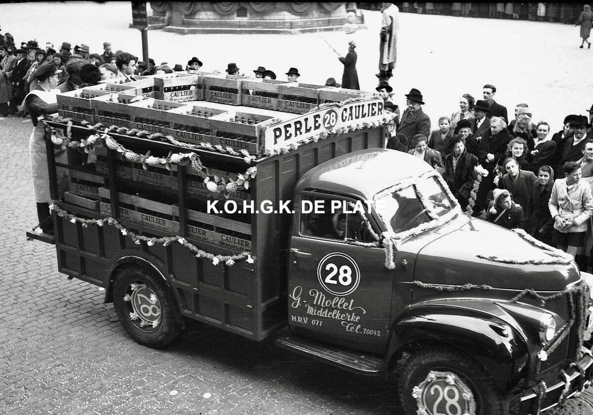 Negatief : 4 x 6,5 cm. - De vrachtwagen van bierhandel G. Mollet uit Middelkerke, hier op het Wapenplein