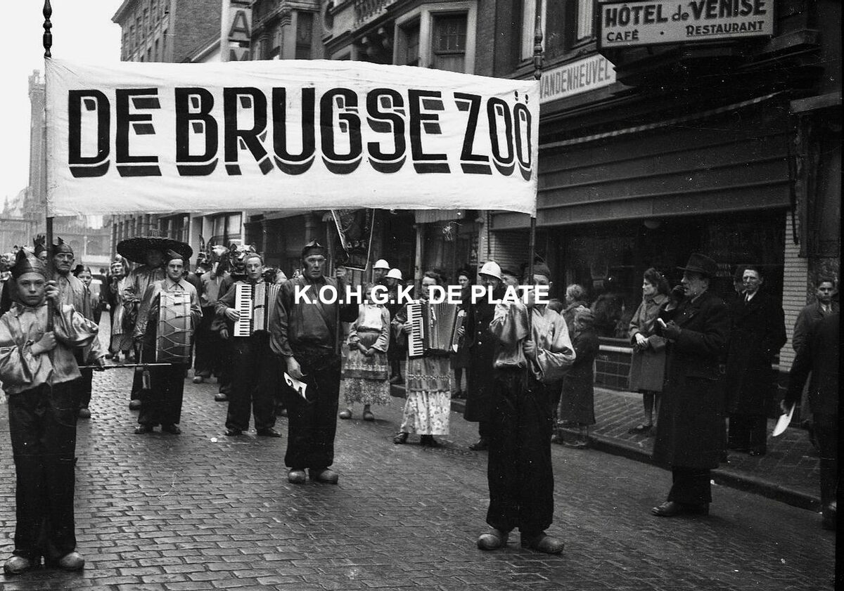Negatief : 4 x 6,5 cm. - De carnavalgroep "De Brugse Zoo" met muziek in de Kapellestraat ter hoogte van "Hotel de Venise"