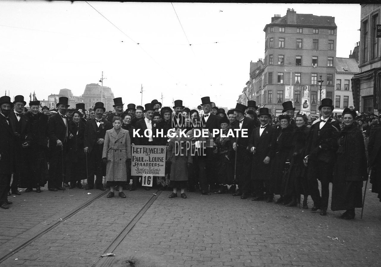 Negatief : 4 x 6,5 cm - Mooie foto. De folkloregroep "Het Huwelijk van Paul en Louise" uit Bredene, hier op de Visserskaai. De leden van de spaarkas "Ons Vermaak" uit het café "Fientje Keters" verkleed anno 1900