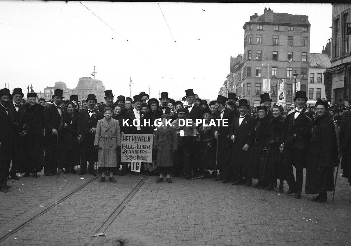 Negatief : 4 x 6,5 cm - Mooie foto. De folkloregroep "Het Huwelijk van Paul en Louise" uit Bredene, hier op de Visserskaai. De leden van de spaarkas "Ons Vermaak" uit het café "Fientje Keters" verkleed anno 1900