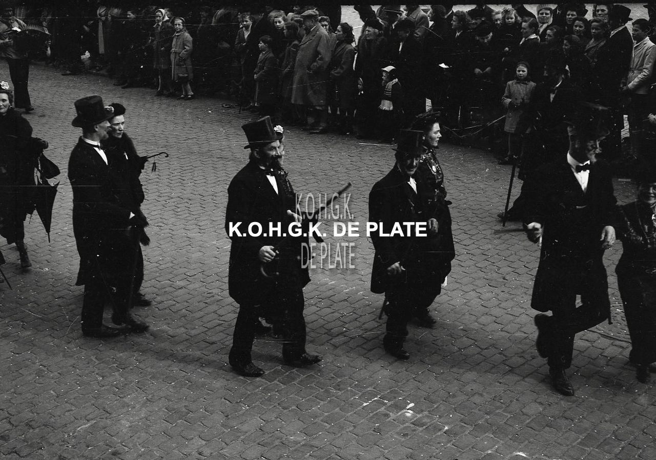 Negatief : 4 x 6,5 cm. - De folkloregroep "Het Huwelijk van Paul en Louise" uit Bredene, hier op het Wapenplein