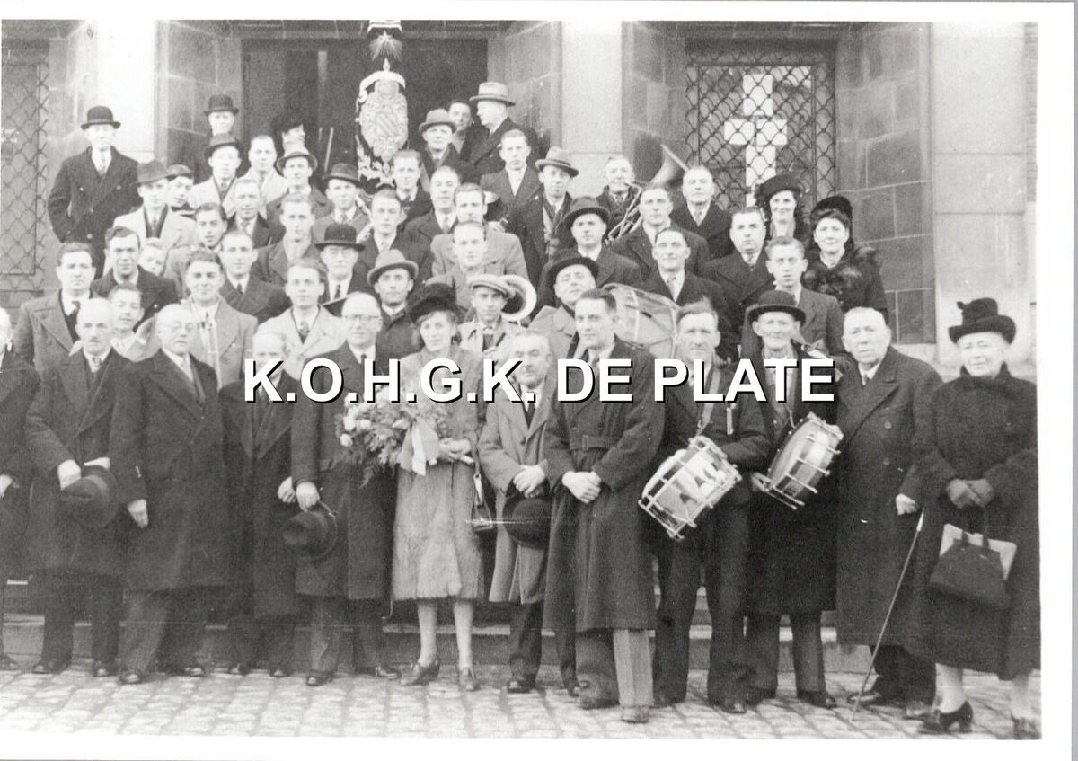 Formaat : 9 x 12 cm. - De fanfare met vaandel op de trappen van het Gerechtshof (toen diensdoend als stadhuis). Ontvangst ter gelegenheid van het 50 jarig lidmaatschap van Arthur Vanhoutte, Evarist Vandenbroele, Karel Deschacht en Constant Schotte. De mevrouw met de bloemen is de echtegnote van Arthur Vanhoutte. Links naast haar, burgemeester Henri Serruys. Uitgebreide beschrijving in : Zo was Mariakerke : deel II / Marc Casier. 2010, p.311. Plate Bib A321