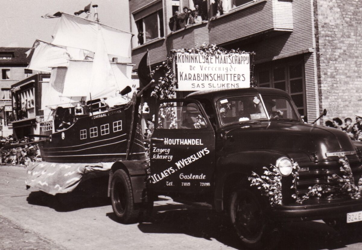Praalwagen, vrachtauto Chevrolet, van de Koninklijke Maatschappij De Vereenigde Karabijnschutters, Sas-Slijkens, tijdens de zomercavalcade te Bredene. Tafereel : Admiraal Pophan. Vrachtauto van Houthandel. Zagerij, Schaverij J.C. Claeys. M. Versluys Oostende.