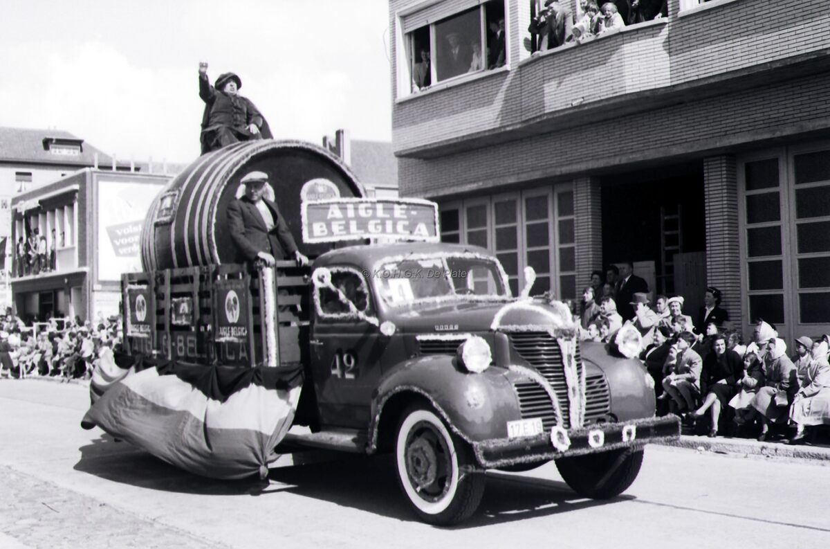 Een reclamevrachtauto, Dodge, voor de bieren Aigle Belgica, in de Driftweg te Bredene tijdens de zomercavalcade.
