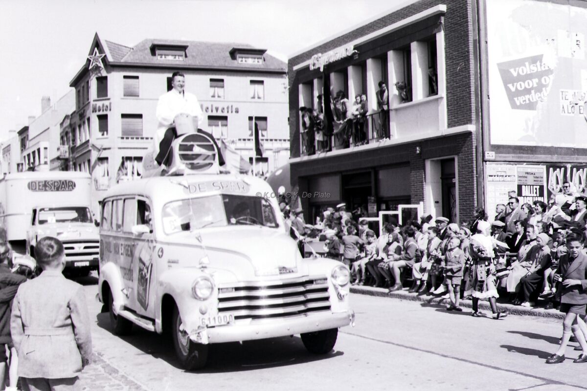 Zomercavalcade in de Driftweg te Bredene. Reclameauto, Chevrolet, van winkelketen "De Spar".