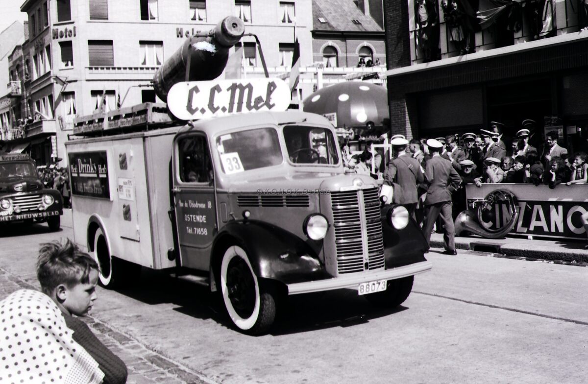 Een reclamewagen, Bedford, voor het chocoladedrankje C.C.Mel uit de Velodroomstraat 18 te Oostende in de Driftweg te Bredene tijdens de zomercavalcade.Op het terras van de herberg is een muziekkorps neergestreken.