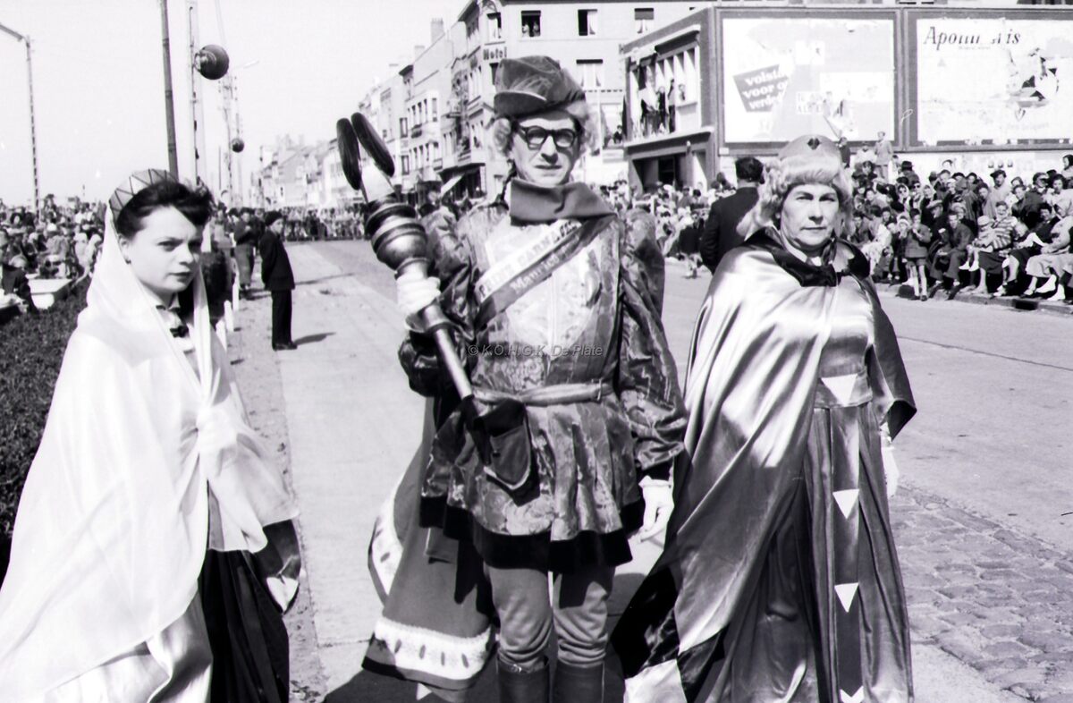 De eerste carnavalprins van Bredene, Maurice Lauwereyns, als Maurits I in de zevende zomercavalcade te Bredene. In zijn hand een indrukwekkende scepter. Een sierlijk bewerkte staf met op de top een houten mossel vervaardigd door Camiel Geselle. Hij is getooid met een groot erelint in rood-witte kleuren, met in gouden letters "Prins Carnaval 1954". Maurits I. Rechts de groothertogin (Elisa Beernaert) en links de prinses (Yolande Beniest). (Jaarboek Ter Cuere 1996)