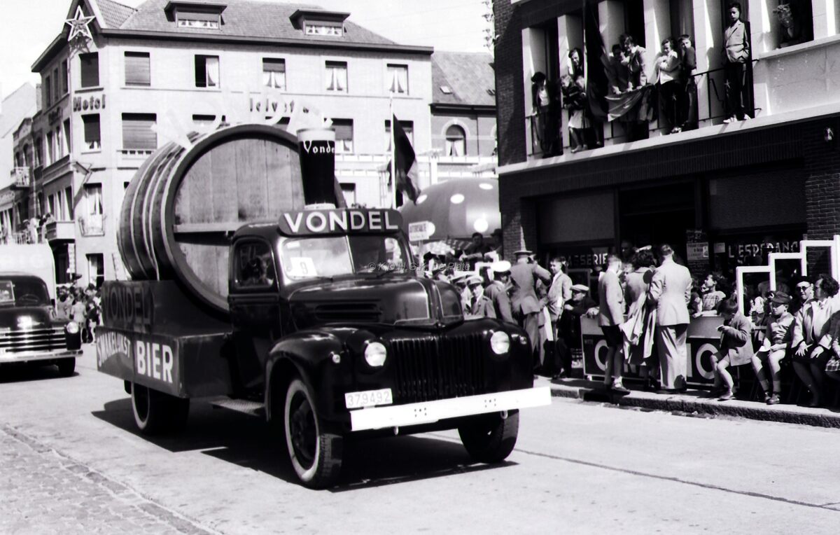 Een reclamevrachtwagen voor Vondel bier, van brouwerij Vondel uit Meulebeke, in de zomercavalcade in de Driftweg te Bredene.
