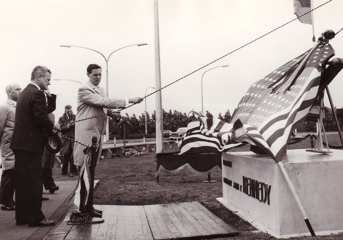Burgemeester Jan PIERS bij de onthulling van het monument in aanwezigheid van vertegenwoordigers van de Amerikaanse ambassade.