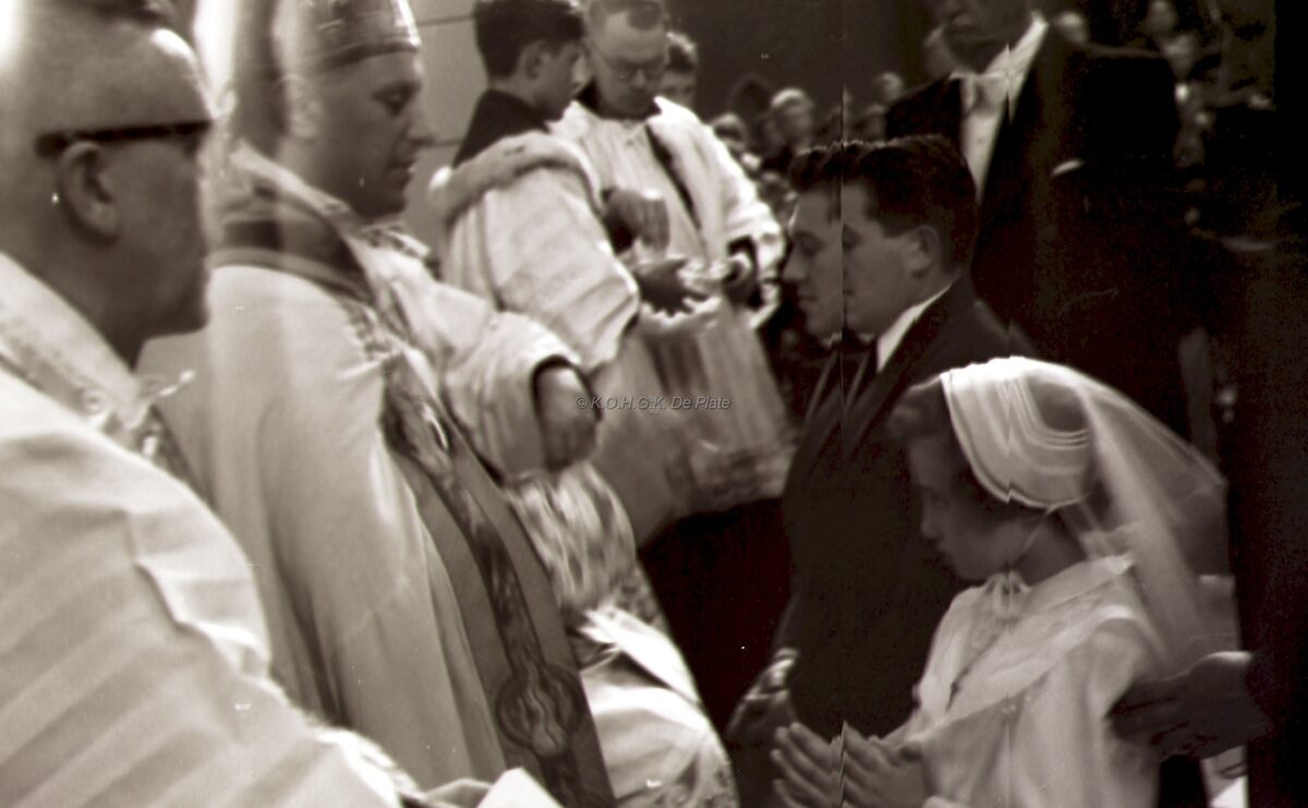 Een meisje krijgt het vormsel in de Sit Jozefskerk door bisschop Emiel DE SMEDT.