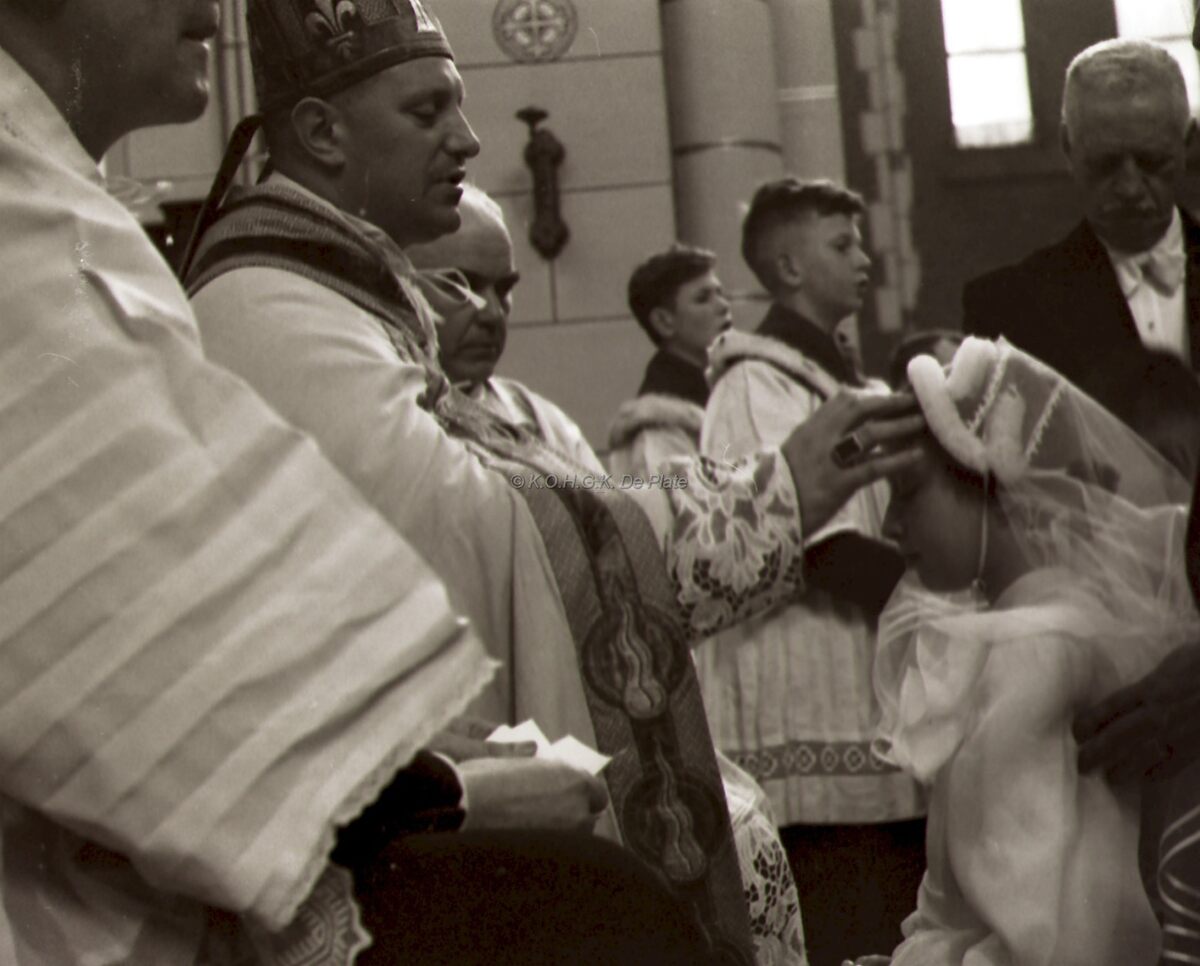 Een meisje wordt gevormd in de Sint Jozefskerk door bisschop Emiel DE SMEDT.