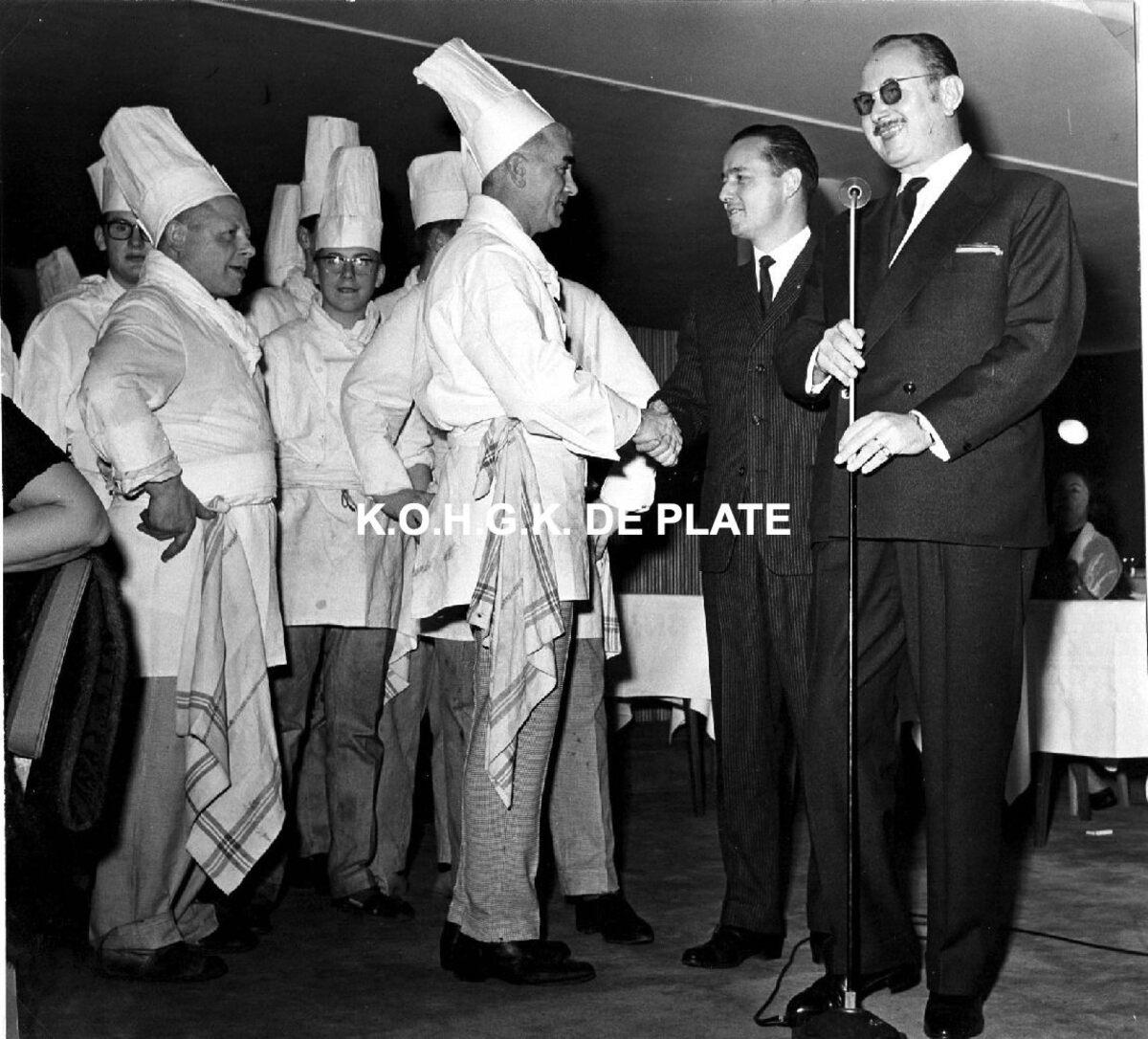 Formaat : 18 x 20 cm. - Rechts, Roger De Ramée, directeur van de Kursaal. Derde van rechts, meesterkok Richard Parmentier.