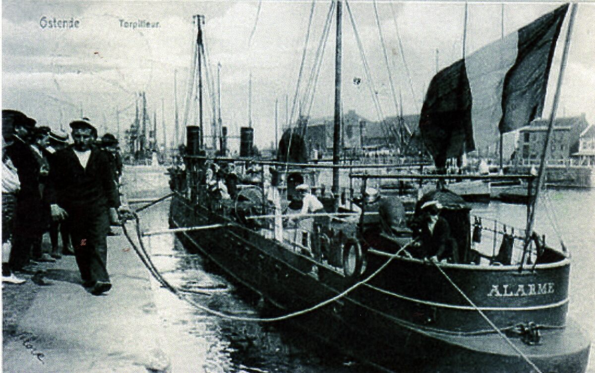 Ostende - Le torpilleur Français Alarme. - Het Franse oorlogsschip deed onze haven aan op 14 augustus 1901. Hier in het tweede handelsdok. Rechts, "Hôtel de Barcelone", Keizerskaai 16