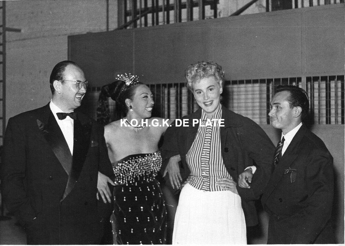 Formaat : 13 x 18 cm. - Joséphine Baker in het gezelschap van : Roger De Ramée, directeur van het Kursaal, Dany Dauberson, zangeres en Didier Michel, zanger imitator.