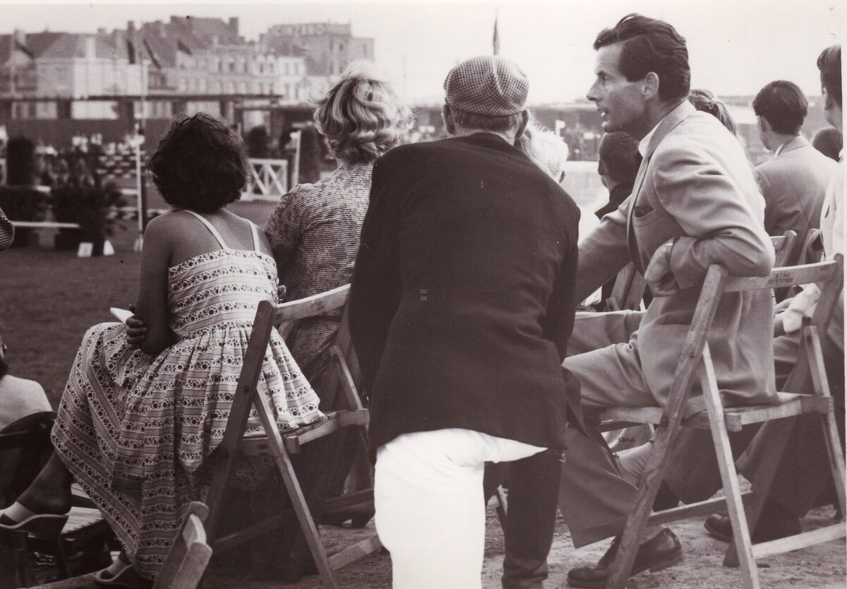 Formaat : 13 x 18 cm. - Peter Townsend, de toenmalige vriend van Prinses Margaret van Groot-Brittannië op een jumpingwedstrijd op de tribune .