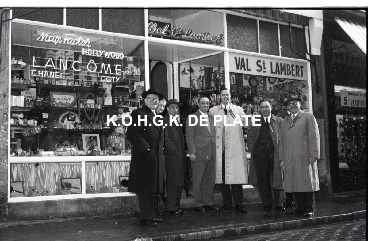 Negatief : 6 x 9 cm. - Theo Dehaene, links van burgemeester Jan Piers, voor zijn handelszaak "Maison Dehaene", Kapellestraat 6
