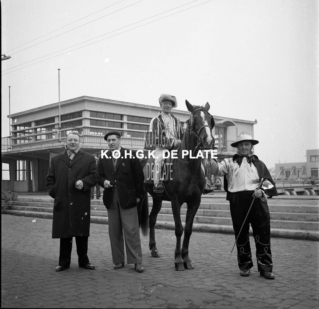 Negatief : 6 x 5,5 cm. - Links, Fernand Monteny met prins carnaval te paard. Hier op de Visserskaai, met op de achtergrond, de nieuwe garnaalmijn