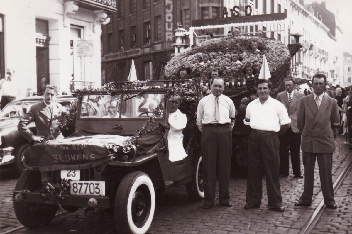Praalwagen nr.23 van een supportersclub van voetbalploeg ASO uit Sas-Slijkens in de Van Iseghemlaan, komende uit de Sint-Peterburgstraat.