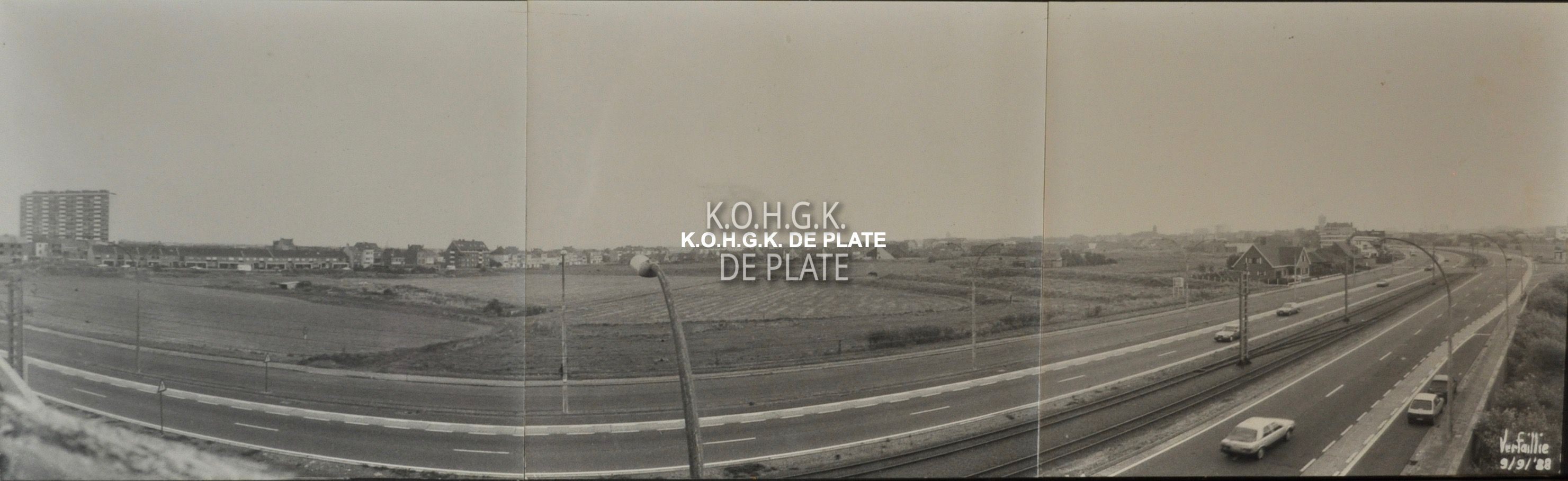 Panoramazicht op het nog onbebouwde gedeelte van de Vuurtorenwijk gezien vanaf de Dokter Eduard Moreauxlaan nu Koninklijke Baan tegenover het Militair Hospitaal