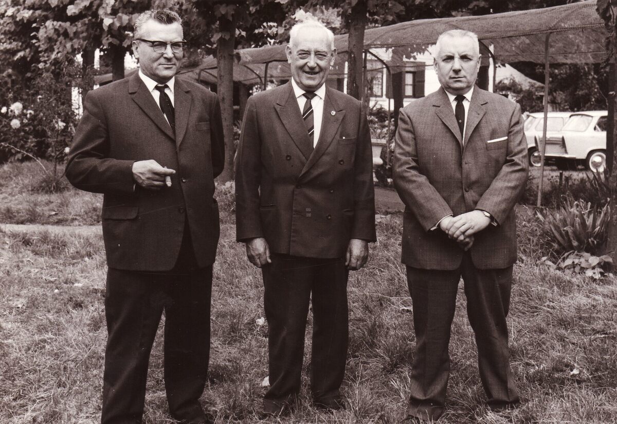 Formaat : 13 x 18 cm. - De inrichters van een autotentoonstelling op het terrein van de Sint-Sebastiaansgilde aan de Leffingestraat. Ingericht door de Verenigde Merkagenten van 25 tot 27 september 1965