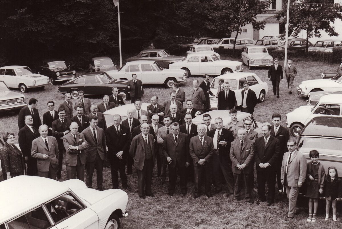 Formaat : 13 x 18 cm. - De inrichters en deelmemende garagehouders aan een tentoonstelling van auto's op het terrein van de Sint Sebastiaansgilde aan de Leffingestraat. Ingericht door de Verenigde Merkagenten van 25 tot 27 september 1965. Tweede van rechts vooraan John Hermans, gemeenteraadslid en journalist.
