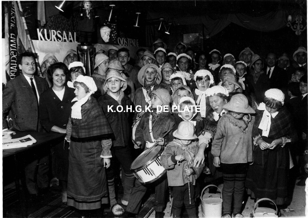 Formaat : 18 x 24 cm. - Ook de folkloregroep "De Vismijnvrienden" waren aanwezig. Links, Willy Bosschem, persattaché van de Kursaal en naast hem (onder voorbehoud), juffrouw Paulette de Keyzer, hostess van de Kursaal.