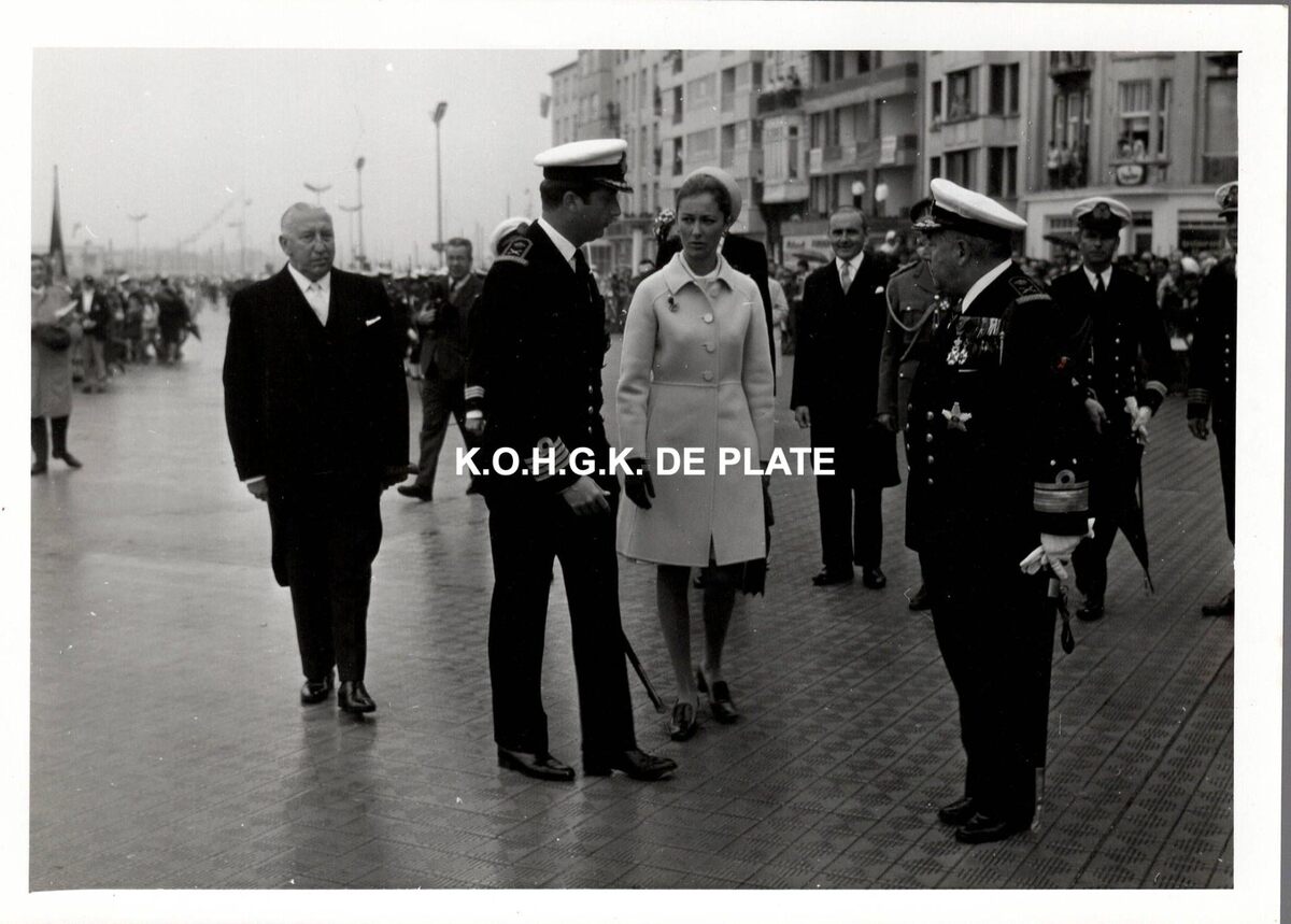 Formaat : 13 x 18 cm. - Rechts, L. Lurquin, divisieadmiraal van de Zeemacht. In het midden, de provinciegouverneur van West-Vlaanderen, Pierre van Outryve d'Ydewalle en links, minister P.W. Segers.