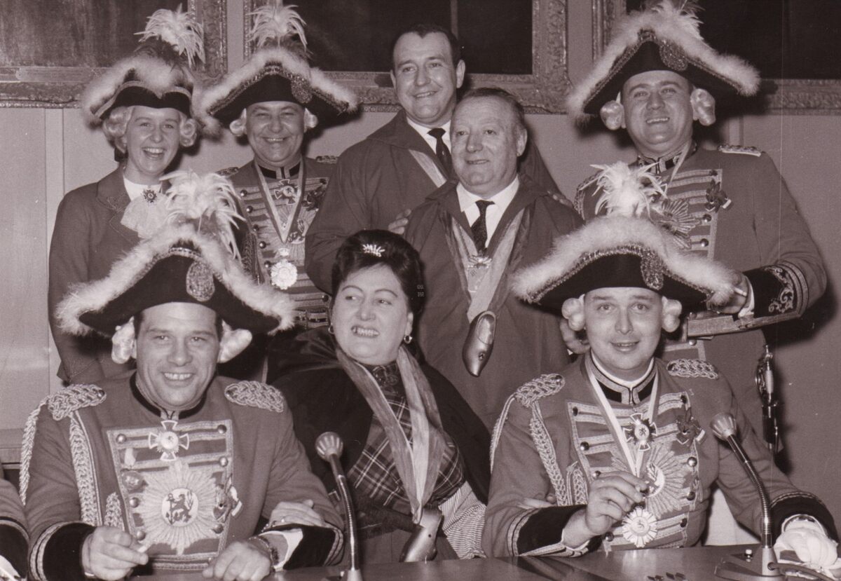 In het midden Blanche of Meetje van de koaje alias Blanche Belpaeme tussen het gevolg van de Prins Carnaval van Dusseldorf. Achter haar staat Fernand Monteny of de" witten van de koaje", allen lid van de "Orde van de Kloeffe". Plechtige ontvangst van de Prins Carnaval van Dusseldorf en zijn gevolg op het stadhuis naar aanleiding van het "Bal du Rat Mort" en het "Garnaalbal"