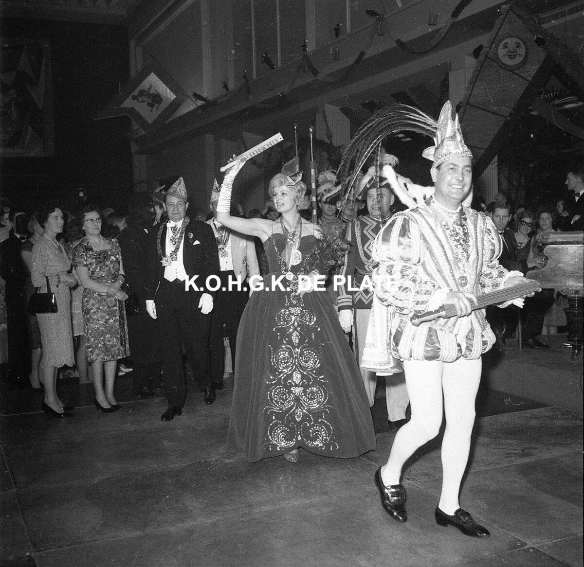 Formaat : 12,5 x 12,5 cm. - De prins Carnaval van Düsseldorf, zijn eredame en hun gevolg doen hun intrede op het Bal du Rat Mort. Zij waren vroeger op de avond ook aanwezig op het "Garnaalbal" in het "Wit Paard"
