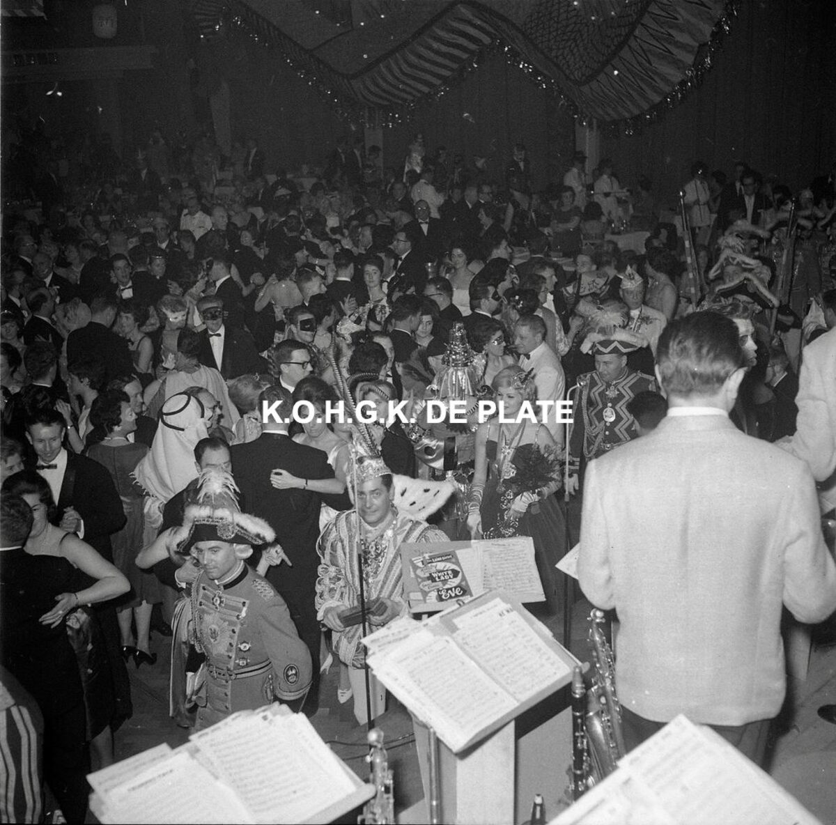 Negatief : 6 x 9 cm. - Veel volk op het bal. Hier vooraan, de Prins Carnaval van Dusseldorf en zijn gevolg.