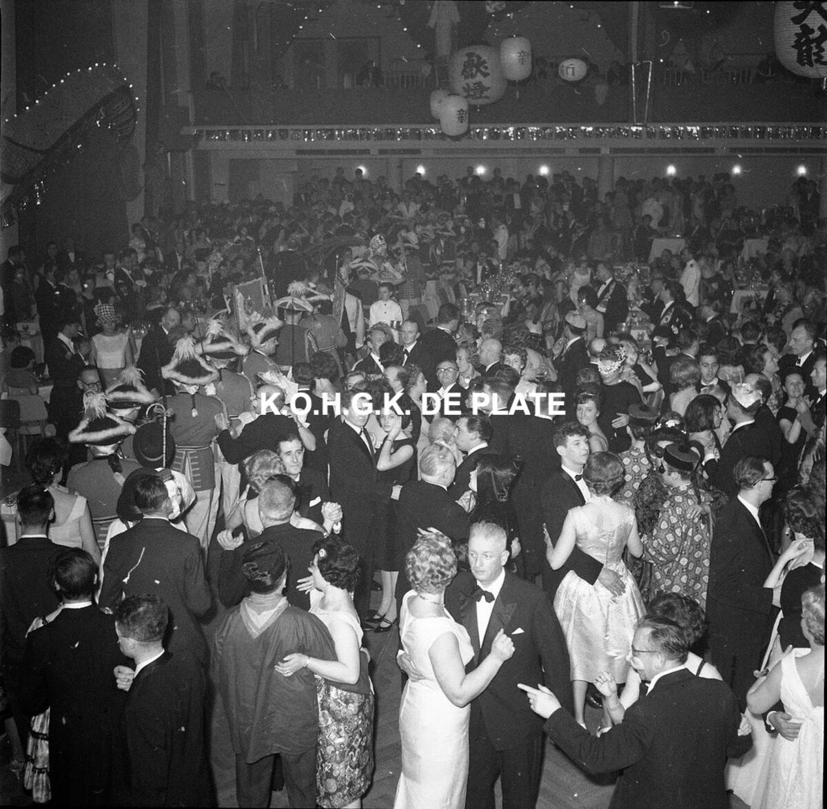 Negatief : 6 x 9 cm. - Veel volk op het bal. In het midden, het gevolg van de Prins Carnaval van Dusseldorf.