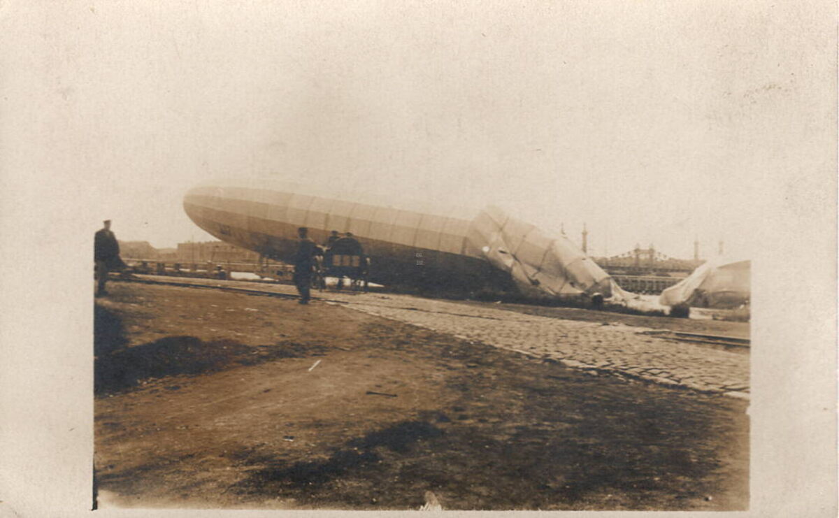 Met opdracht Londen te bombarderen werd de L.12 boven Dover getroffen door een granaat van de Britse luchtdoelartillerie in de nacht van 9 op 10 augustus 1915. Zwaar beschadigd werd de Zeppelin op sleeptouw genomen naar de haven van Oostende. Hier aan de Diepwaterkaai. Rechts de Graaf de Smet de Naeyerbruggen, nog met beelden. Verdere literatuur : Oostende 14-18 / Ferdinand Gevaert, Freddy Hubrechtsen. 1995. p.181-187. Plate bib B228.