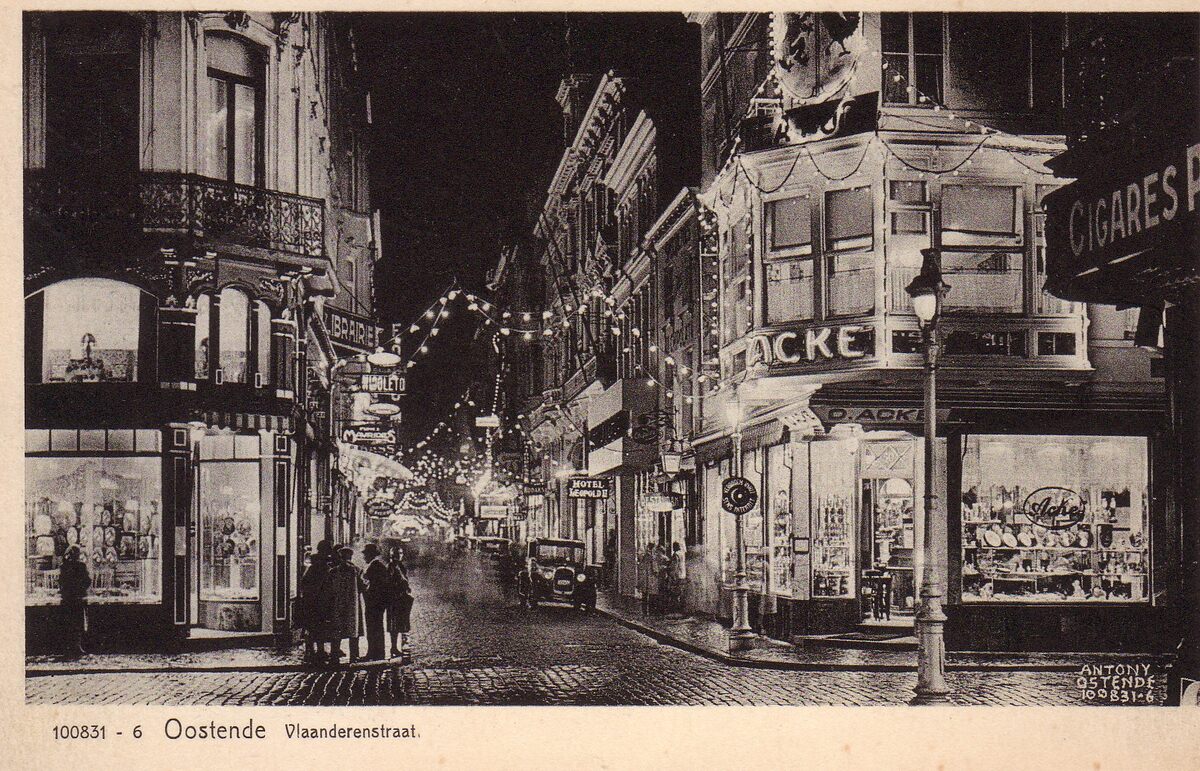 Postkaart Foto Antony, nr. 100831-6. - Oostende - Vlaanderenstraat. - Op de hoek met de Langestraat, de patisserie-tearoom-ijssalon O. Acke (nr. 50), wat verder het "Hotel Léopold II" (nr. 42)