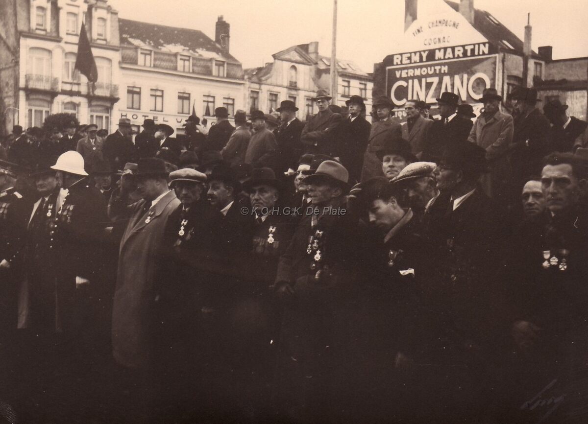 Gedecoreerde oudstrijders voor de eretribune op het Wapenplein tijdens een plechtigheid.